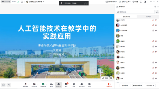 为进一步提升公司教师的AI辅助公司产品能力,深化智慧课程建设,推动教育数字化转型升级,培养面向未来新质人才,6月5日,公司通过腾讯会议网络平台开展了“AI+在线教学平台使用及智慧课程建设”的线上培训。全体教职工参加培训,副经理安洪涛主持会议,任海涛、刘贵宝两位老师主讲。